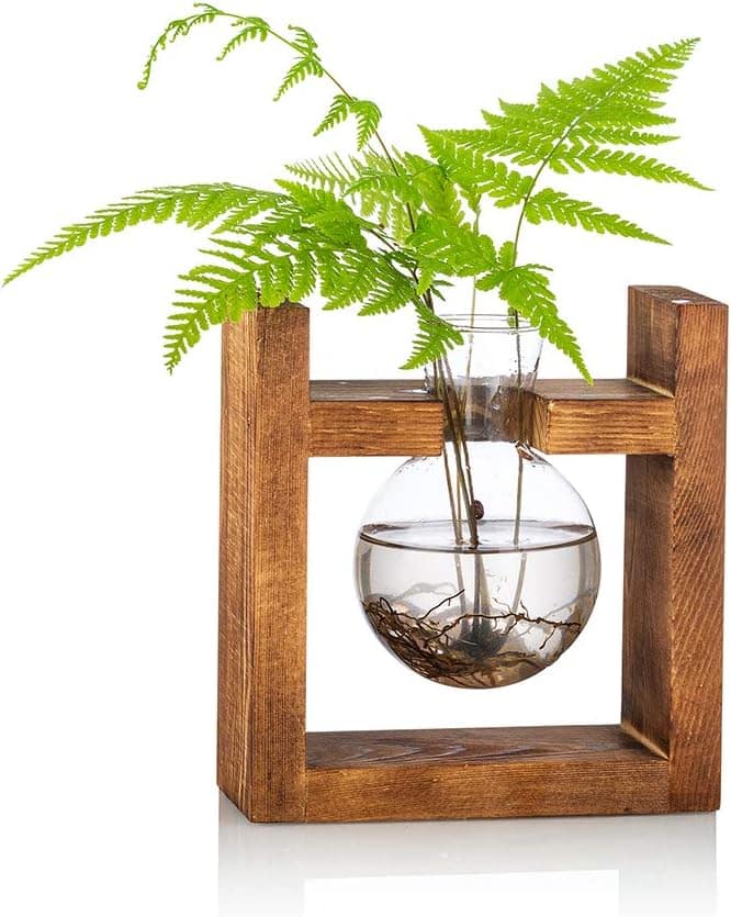 - [Paket beinhaltet] – 1 x Holzständer + 1 x Glas Pflanzvase, elegant und schön, es hilft indirekt, die Innen- und Außenluft zu reinigen und zu entspannen.