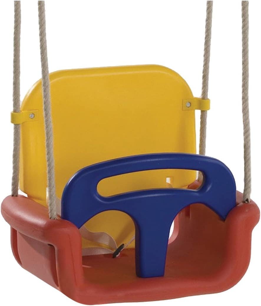 Schließlich kann auch noch das gelbe Rückenteil entfernt und die Kinderschaukel wie ein normaler Schaukelsitz verwendet werden.