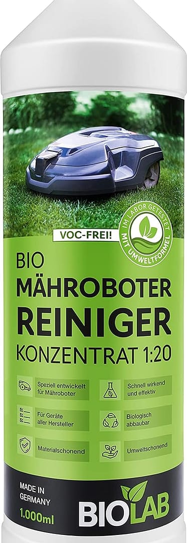 - Lieferumfang: 1000 ml BIOLAB Mähroboter Reinigungsmittel Konzentrat, Flasche mit kindersicherem Schraubverschluss und Spritzausguss. Umweltfreundliche Sauberkeit in Industrie-Qualität. Made in Germany